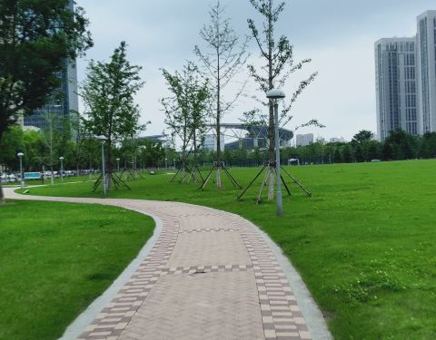 该公园位于天鹅湖南岸,离奥体中心很近,里面的树木刚栽上,还没形成绿阴