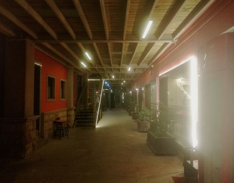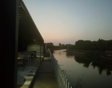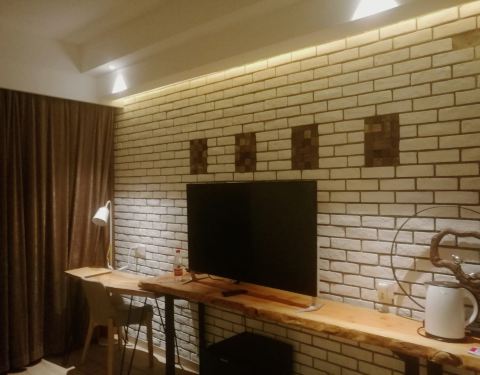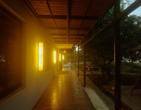 大门入口不是很明显,在辅路边上但大门往里缩进几米开车很容易错过。内部面积不小,很安静,在河边还有烧烤区,客房面积比较大,可以汗蒸。