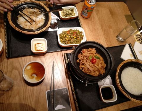 日月光一楼的店面不大 特色是瓦煲饭 瓦煲饭的确很不错,再拌上他们的特制酱油 很好吃 菜的话量比较少 黑椒牛肉 野山笋 菜里面的肉类非常少