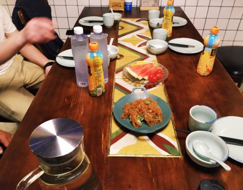 ...早肉、黄瓜手握、煤球饭、送的糌粑小吃、还有个蛤蜊冬瓜汤和蔬菜,再叫了芭乐汁一大罐,两个人吃撑了