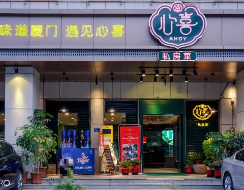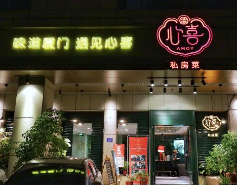 隐藏在山脚下的这间心喜私房菜,在厦门开了11年,来此的大多都是老食客,一进门就可以看到老板热情与老客人打招呼,帮忙点菜,清晰的记着老食客爱吃的菜肴,这画面倍感温馨,好似是到了亲朋好友家用餐。 心喜私...隐藏在山脚下的这间心喜私房菜,在厦门开了11年,来此的大多都是老食客,一进门就可以看到老板热情与老客人打招呼,帮忙点菜,清晰的记着老食客爱吃的菜肴,这画面倍感温馨,好似是到了亲朋好友家用餐。 心喜私房菜不在繁华的闹市区,而是在南山路上艾美酒店入口处,依山而居,非常清雅的地方。这里对于食材要求非常严格,大多数的食材来自乡村里,有着放山乡、跑地鸡,难怪回头率高达90[%]。 味道厦门,遇见心喜,招牌上的字就写着在此用餐的心情一般,吃着就心喜。这里的装修非常清雅,带着一股清新的气息。一楼是大厅,二楼是包厢,可以满足各种需求。 初遇心喜是一位老饕相约才知道其位置,吃上一次就爱上这里,菜色清雅不油腻,独特的手工创意菜非常多,而且食材上真的是着小时候的味道。 入秋就是进补的时节,羊肉枸杞汤喝起来,一上桌就惊艳到了,真是巨大的一盆,两边的龙头非常霸气,边加热边食,真是好味道。来自三明的放山羊,膻味较小是其次,羊肉的肉质才是最棒的,皮连着瘦肉,不肥腻,与萝卜、花蛤等一起炖,那鲜香之味超级赞,一人喝上三碗不是问题。 如果今天不想吃羊,这里的土鸡炖人参也非常赞,采用东北人参与土鸡一起炖,汤色非常清,带着淡淡的回甘,越喝越香,肉咬起来就是小时候吃的鸡肉味。 桌桌必点的醉排骨,可是来此必食的,采用黑猪的小排,切成小块,似糖醋排骨,又不似,有其独特的味道,入口的香、甜、脆的口感,让人一块接一块的停不下来。 手工菜海鲜卷,把海鲜、鸡蛋,还有着多种配料包在春卷皮中,煎的是外皮香脆,鲜嫩的馅料,美味的不要不要的。不过里面有加芫荽,不喜的人勿点哈。 爱海鲜又爱芋泥的人怎么能放过这道鲍鱼扣芋泥,一口鲍鱼,一口芋泥,软糯的芋泥搭配上鲜美的鲍鱼,居然如此美味。 独特的创意桂花竹荪卷,入口的刹那带来了味蕾的惊艳,有着鱼的鲜味,还有着竹荪的脆,肉的弹滑,三者合一,让整个口感都得到了提升。 蔬菜不能少,这里的上汤野菜做的也是超赞的,色泽清雅,清新鲜嫩的叶菜与汤汁相融,味道鲜美而不会咸口。 最后的小点心也是非常的讨喜,各种造型,不论大人小孩都非常爱,而且味道也是不同的呢。 这样的私房菜是不是特别爱呢,不止有其独特之处,重要是食材和味道都是非常棒的,难怪老食客如此多。