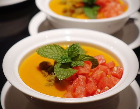 在朋友的带领之下,来到了这个有点低调的私房菜餐厅,这家餐厅的名字叫做心喜私房菜,主打闽系菜,也是最符合我这个地道厦门人口味的菜系。心喜私房菜餐厅是有够低调的,据介绍,它的前身是喜麟阁私房菜,已经默默在仙岳山的北侧山脚下经营了十余年了。 背靠仙岳山,山脚底下的心喜很是安静,没有什么人来车往,有的只是绿水青山和抬头的蓝天白云,有点像是远离城市喧嚣的乌托邦一样。餐厅的布置也简单精致,颇有一股港式的味道,棕色的沙发让人感觉舒适,小清新的粉绿色是墙壁的主体颜色。一楼是大堂空间,二楼是比较有私密性的包厢空间。 第一份上桌的是一人一份的一大杯炖汤,是橄榄炖猪肺汤,汤头很清澈,散发着一股肉香,稍微搅拌一下会透出橄榄的香气。舀一口喝,清淡鲜甜,实在滋补! 鲍鱼扣芋泥摆盘煞是好看,而芋泥倒扣在西蓝花之上,乍一看真没看出来是什么?只有当我一勺舀起,才发现是香嫩喷香的芋泥,松软可口绵密好吃!鲍鱼肥厚耐嚼入味,很Q。 最让人惊艳的莫过于这道桂花竹荪卷了吧,将桂花鱼的鱼肉切片后将竹荪和肉泥卷入鱼肉之中,加入酱料进行蒸煮,吃起来鲜嫩香爽,加入竹荪后口感更加丰富有层次。要注意的是,鱼肉下面铺着一层金针菇也很好吃,不要浪费哦! 龙虾焗面看着很惊艳有木有,不过这道菜的惊艳之处却不在龙虾肉,而在于龙虾肉下的面,是面非面的口感,嫩到一入口就化开的面条,吸收了龙虾的鲜香,口感鲜美!后来才知道这个面条是用薏米做成的,还真是第一次吃到这种口感的面呢!惊喜。 心喜秘制排骨,据说是镇店之宝,听老板说这道菜一年可以卖出上万份,厉害了我的哥!看起来不太起眼的排骨,外表酥脆,吃起来表皮微甜,富有嚼劲,说不太上来的好吃!也真难怪是必点菜了! 餐后的甜点也特别有中餐的feel~看起来像是冰淇淋的膏状物,其实是南瓜泥,南瓜泥上为了增加口感还加入了甜甜的葡萄干和爽口的西瓜颗粒,搅拌一下舀一勺入口,香甜清爽,别有一番风味!