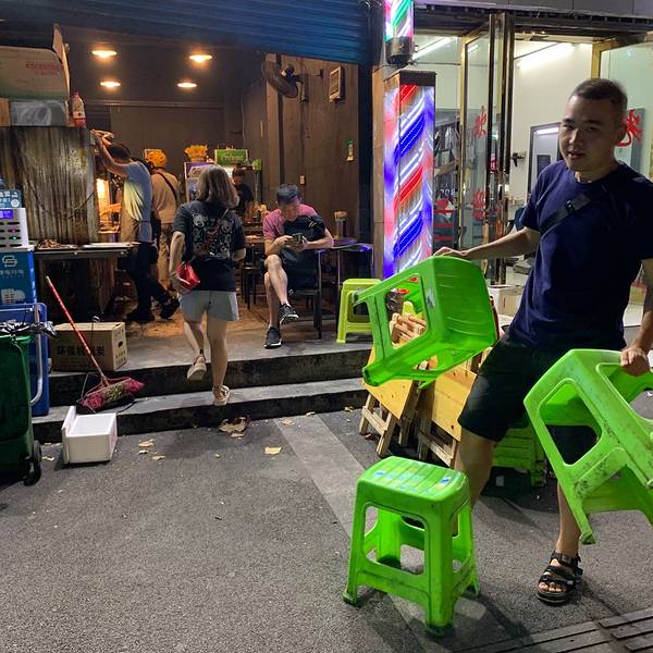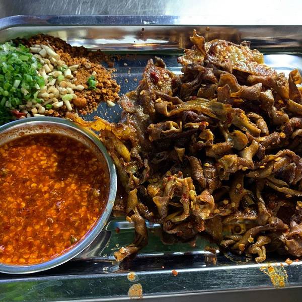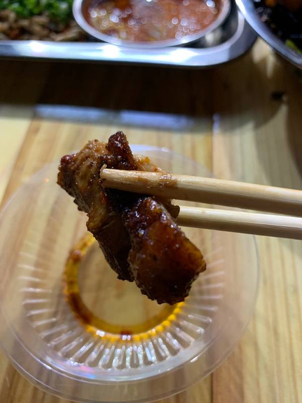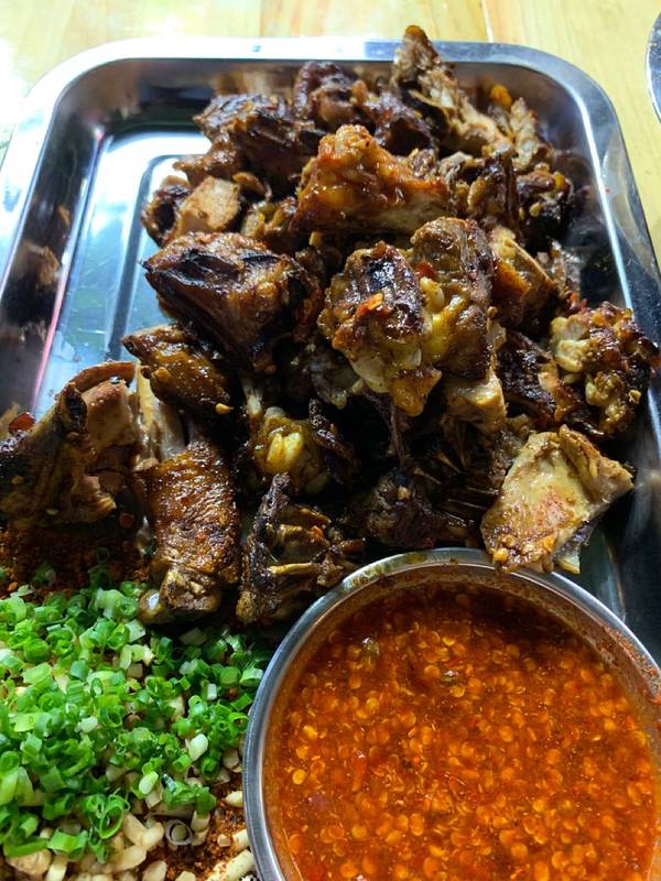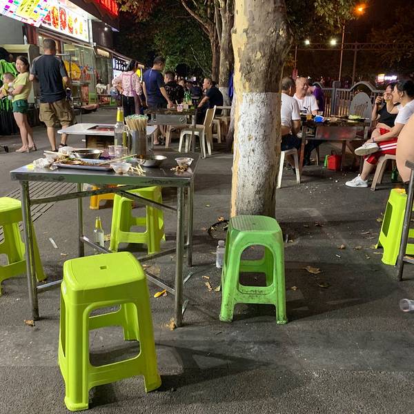 深夜的解放路堡坎上不知何时成了宵夜烧烤的聚集地,在贵阳第一次看到打洪桥烤鸡招牌的烧烤店就是他家。 不建议驾车前往,解放路主干道上没有停车位。由于是在堡坎上,走在路边不容易看到,前往时定位东大肛肠医院对面就对了。 这一排的烧烤店就属他家的生意最好,刚坐下服务员就告知需要等待半小时以上,询问我们是否愿意等待。虽然堂食的桌看上去都已上齐,但是从店里时不时发出的外卖接单声可以看出生意兴隆。 就餐环境全为户外露天,一张不锈钢方桌、几张塑料板凳架于人行道上就开吃。 从菜单上看,他家的价格还算合理,鸡腿25元/个、鸡胸20元/个、鸡皮30元/份、鸡肠30元/份。 先上的是鸡皮和鸡肠 鸡皮:分量感觉不足,且烤制得焦嫩不一,烧烤的功夫有待提升; 鸡肠:直接烤糊了,缩成了一小点,吃起来干巴巴的,口感不佳。 鸡腿肉:最满意的就是鸡腿肉了,和贵阳风格的酱油烤鸡相比,汁水更多,鸡肉更为鲜嫩,最爱这样的口感。 鸡胸肉:鸡胸本身的部位决定了烤制起来会不怎么好吃,干柴口感逊于鸡腿肉。 特别提示:他家是默认在烤制时刷很多辣椒的,如果吃不了辣,在点单时要提前告知(等待的人太多了,他家没有少辣的做法)。提供两种蘸碟,一种是贵阳常用的辣椒面+折耳根末,另一种特别推荐,是遵义的做法:多种辣椒面混合调制的辣椒水,虽然辣味十足(且为生辣),但是越是这样,越让人停不下筷子,欲罢不能!