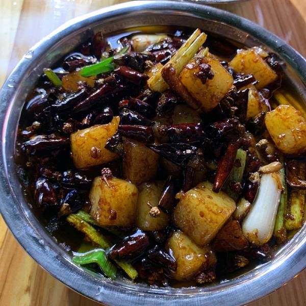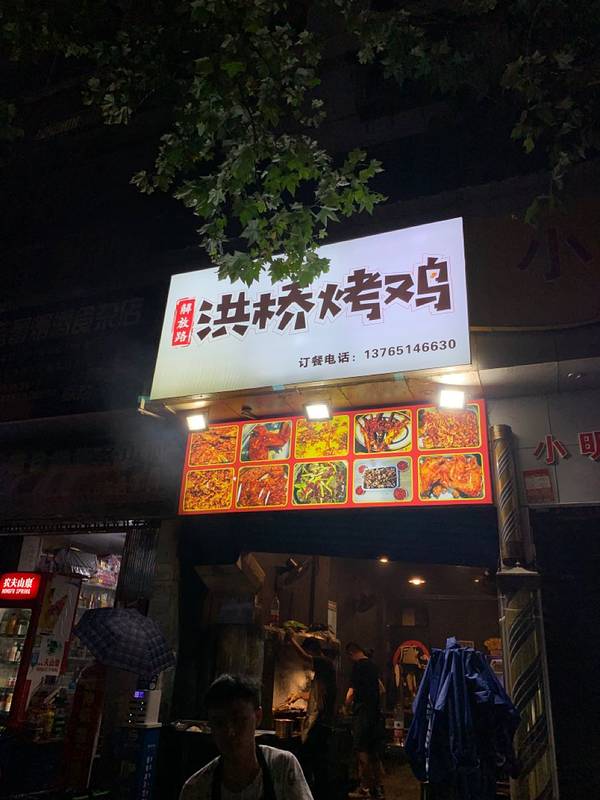 化工厂洪桥烤鸡的名声在名城遵义可谓响亮,在贵阳看到这家打着洪桥烤鸡招牌的店已久,趁着夜色前去品尝一番。 停车:店面地处主干道解放路旁的堡坎上,路边无法停车。最近的停车处在南厂路的都市国际地下停车场(对外停车),4元/小时。停好车后,步行3分钟即到。 环境:店内有3个方桌,每桌能坐下4个人,但是因为烧烤台也在店内,温度颇高,且油烟味较重,无客人选择在店内就餐,都是将折叠桌摆在店门口,就餐环境比较简陋。 服务:晚上9点半到店,告知需要排队40分钟,生意火爆。之前听说他家的烤鸡辣椒放得很重,所以特地前去烤制台告知老板少放点辣椒。因为排队等餐,墙上贴了很多堂食的订单信息,而且外卖不断,老板告知无法区别,要么就只能不放辣椒,无法做到少放辣椒。可能是生意太好了,服务意识比较淡薄。 口味: 烤鸡:是遵义烤鸡的风格,入味,鲜嫩。辣椒水是特制的,其他地方见不到,特别辣,不能蘸太多。同时也有折耳根和辣椒面的蘸碟,个人更爱特制的辣椒水。鸡腿肉的口感比鸡胸肉好,鸡胸肉的部位决定了肉质会比较柴。 爆炒鸡血:第一口感觉就是太咸了,筒筒辣椒炸糊了,炸的时间过久,导致鸡血都有糊味。另外鸡血却又太嫩,不太能接受。 炒米豆腐:外皮不脆,没能做到外焦里嫩,火候的把握欠佳。 价格:两人吃了180元。其中,炒米豆腐25元、爆炒鸡血30元,分量不多,有些偏贵