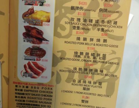 在楼下看到招牌,上网查了一下,发现这家店还是挺有名的,所以就上去吃吃看。楼梯很小很窄,当时心里面还有一点打鼓,结果上去以后豁然开朗,整个店布置的挺大气的。招牌的烧鹅饭,当然重点是在鹅,米饭是次要的。烧鹅是有水准的,皮很脆,金光澄亮,油脂丰富,蘸料比较偏酸。感觉就蘸料来讲的话还是甘牌的更好吃一些。