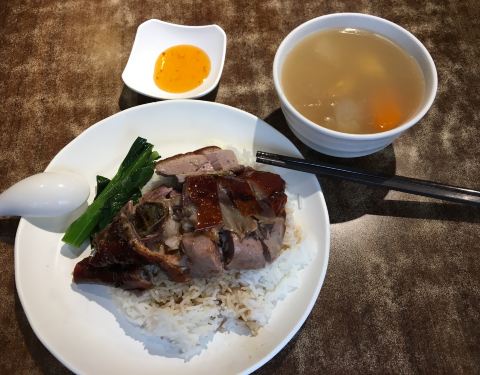 深井的总店位于香港的郊区,真的要去总店吃一次是不容易的,好在位于中环繁华的地段就有深井的分店,虽然门店很小,但是招牌足够大,还是很容易看得到的。窄窄的楼梯上去发现餐厅其实蛮大的,装修的也还不错,必吃的烧鹅是一定要点的。一份烧鹅饭会搭上一碗例汤,另外还有几根蔬菜,这就是最常见的香港人的午餐。