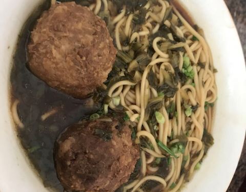 普普通通的一家小吃店,早上和中午生意很好,馄饨是中馄饨,馅料很足,有肉馅和菜肉馅,也可以点一半一半,面是粗面有嚼劲,狮子头一般