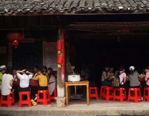 【位置】桃渚古镇的主街上,从西往东走,大概在1/3位置,虽然旧但还是挺明显的招牌在随风飘扬。 【环境】两百多年的宅子了,坐在廊下,装点着红灯笼,真有点喜宴的感觉。就是虫子有点多,甚至还招来蜜蜂。 【服务...