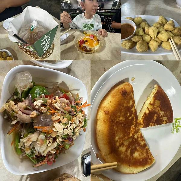 《4000公里一个月环游云南》 来到西双版纳,热的都不太想出门吃饭了😂 还是临走前一天从景区回来,特意完成一下吃当地小吃的“仪式感”😁 【环境】导航位置很准,旁边就是一个停车场,开车倒是很方便。路边有一个门头几张桌子,停车场里面的部分空间更大,应该才是“老店”吧。但是没有空调,喷雾的电风扇吹得说实话体感不太舒服,而且水雾喷到饭菜上不太适应哈。 【口味】根据推荐点了几个特色,以一个外地人的口味来说,可以接受但也没有特别喜欢😄 平常很喜欢吃酸的,但是招牌柠檬系列里面的|柠檬米线^还是有点超酸了哈,|柠檬鸡脚筋^味道正好,但是又太有嚼劲了,还是喜欢软烂一点的。 |包浆豆腐^是特意为爸妈点的,因为他们一直错过外面小摊上现烤的,可惜上来发现确实差别比较大,一来内部“包浆”口感不明显,二来炸的有点腻。但是不比较,单独看这道菜的话,还是可以的。 |佐料牛肉盖饭^还不错,牛肉还是比较入味的。 相对而言这里点的几个甜品更满意些。|炒汤圆^小小糯糯的,甜度适中;|睡映椰^最喜欢,大热天里冰冰凉凉很舒服,不过,虽然它有个陌生的名字,但吃起来跟海南的清补凉和广东的杨枝甘露或者芒果西米露真的差不多哈。