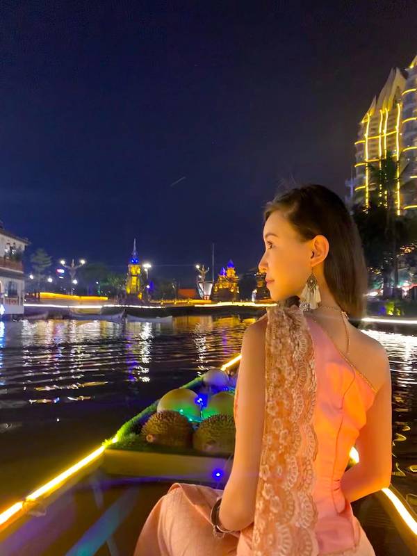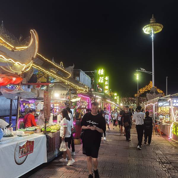 这是紧邻着星光夜市的一条街,街道两旁有很多东南亚纪念品小店、工艺品商店,特别是西双版纳地区有名的网红餐厅在这里都有分店,要是早知道这样,我们就不会在告庄大街上的总店里傻等位子了!小街的后半部分延伸到了澜沧江边的人工河以及星光夜市,夜晚灯火辉煌的景色异常漂亮,吸引着不少人都在这儿游船和拍照!