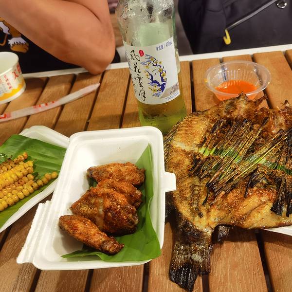 水果餐+烧烤宵夜,非常棒!晚上的赶摆夜市非常热闹,找一个湄公河边的位置,做下来吃吃宵夜,喝喝啤酒~逛夜市的时候买了个葫芦丝,回酒店自己学着吹一吹月光下的凤尾竹~