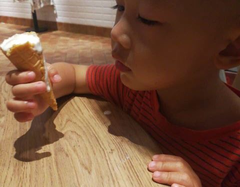 小吃拼盘味道不错!甜筒好吃!只有一个儿童座椅,等了一会也坐上了。歹歹的长了肉了!