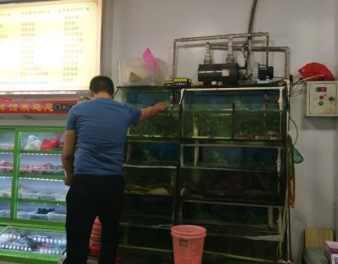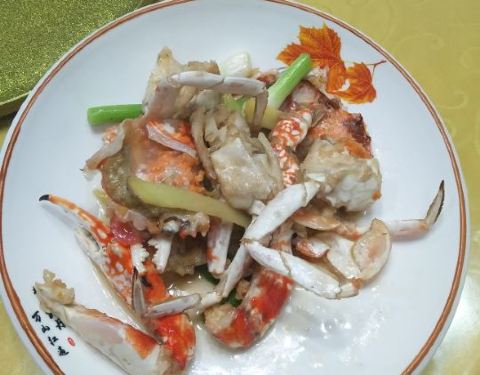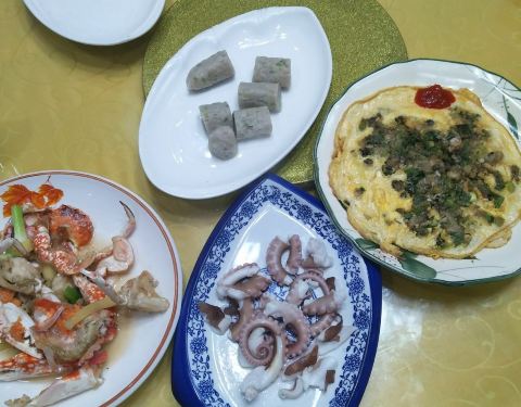 趁着清明小假期过来偷闲几日,到惠安时已是晚上近十点,沿渔港这条小马路上虽说餐馆很多,但几乎都打烊了,幸好还剩这家愿意做生意!餐馆对面靠着渔港的路边都可以停车,十分方便。此时反正也没其他客人了,老板安排我们俩坐大包厢,上茶、介绍菜、寒暄,很是热情!这里的海鲜确实比较新鲜又个大,螃蟹260元/斤,张牙舞爪很诱人,炒熟后非常鲜美;每只九节虾都将近我老婆手掌大小,30元/只,一只两口吃完,很满足的感觉;八爪鱼比我以前吃过的都更肥厚,肉质弹牙爽口有嚼头,价钱忘了;海蛎煎份量足,味道比厦门的强多了;鱼卷以前没吃过,不评论!本来还想来一份魔鬼鱼尝尝,老板娘劝说份量太大吃不完,这才放弃了。而最后我俩也没辜负厨师的加班与老板的热情,消费了五百多块。虽说都快赶上自助海鲜价钱,偏贵了些。但出门第一餐贵就贵吧,这就叫痛快嘛!
