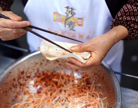 犍为县的许四孃薄饼,深受当地人喜爱,很多都几十个几十个打包回家,味道确实不错,从早到晚忙碌,起早贪黑赚的都是辛苦钱,小摊子不亦乐乎。