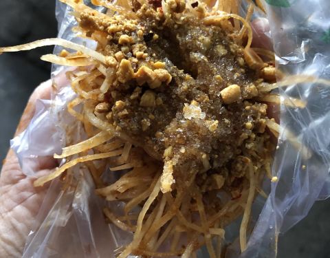 去犍为旅游,搜了排名居前的美食,桐子林许四孃薄饼豆腐干也是当地著名小吃啊。上次去犍为,早上离开时还没开门,这次一定要吃到。到了犍为先去这家,好在排的队还不算长。许四孃一人独撑店前的摊位,动作非常麻利,同时耐心回答我们的问题,前面排的当地食客也热心给我们介绍。若非亲眼所见,难以相信一个小小的豆腐干(三角形油炸豆腐)、一张薄饼(类似我们的春卷)能卷进那么多的馅料和调料,然后在醋里浸一下,酸甜辣香的成品就可以吃啦。我吃了一个豆腐干一个薄饼,味道真的很不错,关键是很有特色。酸甜辣加上白糖的沙沙感,真是有点奇妙的爽口诶。个人觉得豆腐干更好吃,脆脆的。薄饼浸了醋,吃到下段很酸了。总之都好吃,可以要求少放辣椒,不过我都吃的正宗的。