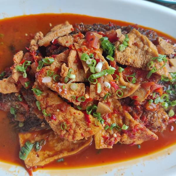 附近找了家小馆子,味道简单美味,老板娘还超热情地请我们吃了原味乳扇(比烤乳扇好吃),除了停车不太好找位置,值得一尝。茉莉花煎蛋酸辣豆腐鱼
