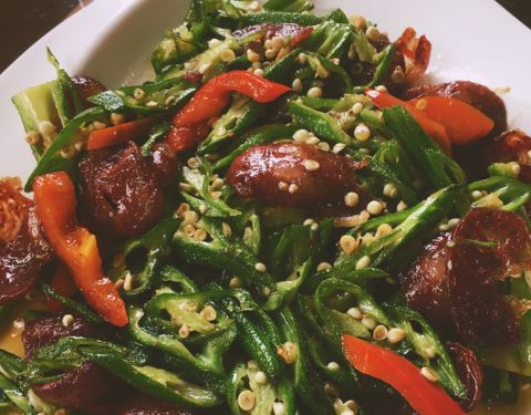 按照点评推荐点了石榴花炒蛋,腊肠炒秋葵,小炒肉,水性杨花汤还自己加了个炒鲜菌,因为有人不吃辣,...