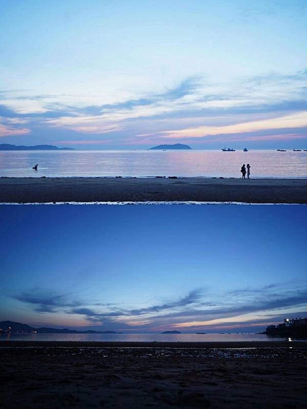 俯瞰双月湾全貌,以远处天空、大海为背景,日出日落的氛围下很出片