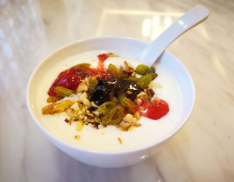 新疆行第9天,返程日。人的精神一旦松懈,大概就很容易觉得累吧。这天是我起的最迟的一天了(其实也就8点),到餐厅吃早餐的时候已经9点左右。 人不多,但菜品非常多。各色冷菜、炒菜、点心、水果……简直要犯选择综合征。喝了碗酸奶,怪我自己加了太多的葡萄干,于是很甜很甜。小伙伴没加的天赋就挺好。面条种类很多,选了荞麦的,三种浇头,选了哨子,口味挺棒!