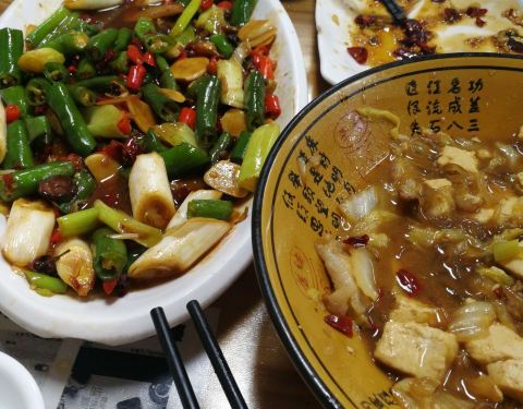 外面装修不怎么样,但味道还不错,鸡48元/份,茄子20元/份超好吃,值的推荐。2人吃了100元左右,还未吃完,点多了,菜的份量超足。吃完了才照的。