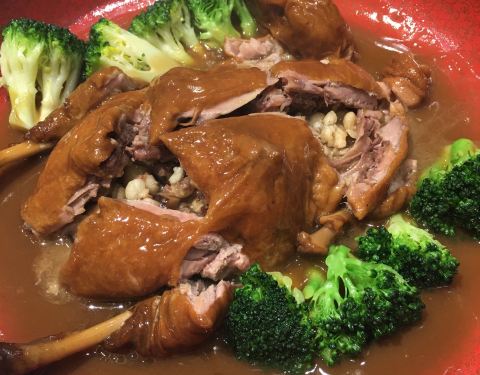 今日过去食午餐试了两款新野,一个系八宝BB鸭,一个系脆皮黑芝麻艾糍丸。 八宝BB鸭78元,味道唔错。鸭皮好食但肉太软烂,比较适合老人。八宝中以薏米为主,莲子、栗子只是象征性地放了一两粒。貌似八宝只是个虚数...今日过去食午餐试了两款新野,一个系八宝BB鸭,一个系脆皮黑芝麻艾糍丸。 八宝BB鸭78元,味道唔错。鸭皮好食但肉太软烂,比较适合老人。八宝中以薏米为主,莲子、栗子只是象征性地放了一两粒。貌似八宝只是个虚数,但值得一试。 脆皮黑芝麻艾糍丸21元4个,作为餐后甜点相当好。颜值在线,口感外表微脆,内软糯,中间流心。推荐。 淮山紫薯皇帝菜36元。之前已经食过觉得十分喜欢,养眼又美味。这次莫不犹豫选了它,没有令我失望。 午餐时间开了一个小厅,里面环境特别好。服务是一如既往地令人满意。