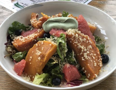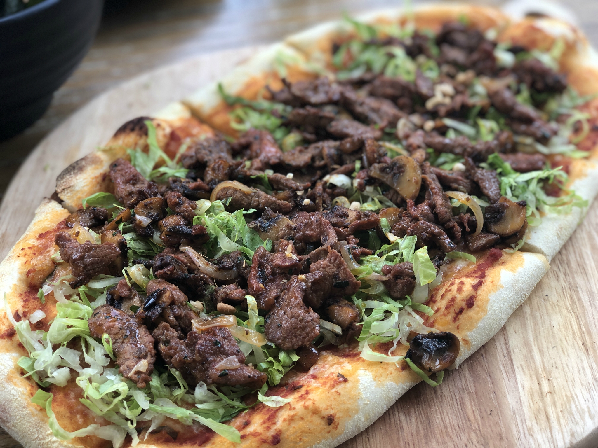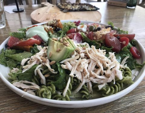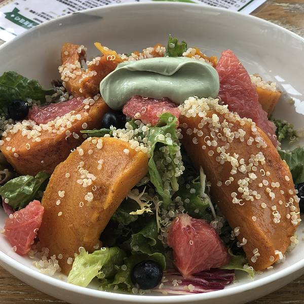 在来福士上班,却一直没机会来。这次朋友请客,于是提议到这里来吃饭。电梯直达,空间很大,还有室外区域,春秋天会比较舒服,我们选的3面玻璃的区域,稍微有点闷热。 2个人点了2杯饮料、1份披萨和一个沙拉3兄弟,量真是超级大!披萨是黑松露温泉蛋,不知道饼皮为什么是黑的。沙拉其实是3个沙拉的组合,3个沙拉自选。他们家主打有机,所以我觉得菜品口味是其次吧!反正环境是好的。室外还有羊驼和小兔子,全都不怕人,羊驼真可爱啊!随便摸!非常适合小朋友来吃的一个餐厅。 临走买了个超贵的酸奶。特别浓厚,我分了两天才吃完。不是特别想再尝试第二次了。