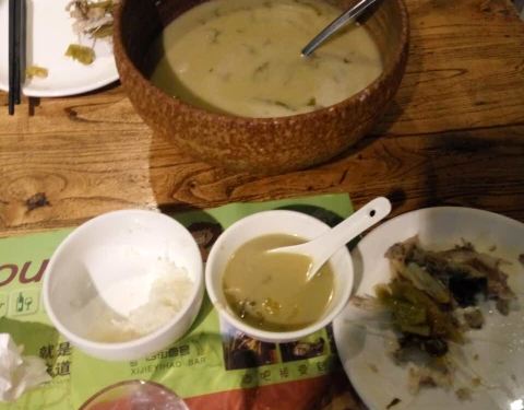 酸菜鱼的味道没的说,我们两人把鱼都吃尽了,服务员的服务也很周到。