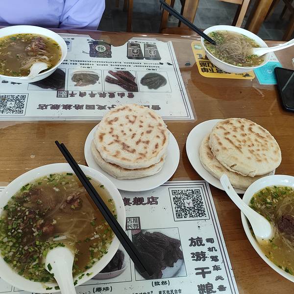 哈哈 此行西宁发现的又一宝店。开斋节期间正常营业 实在感动得不行。 离火车站不远 打车起步价,看起来店面还挺新的。 来说说头牌 牦牛汤 15小碗 18大碗 里面有那种水晶粉丝 真的比普通的粉丝好吃的太多了,滑溜透明有韧劲 但是又不是那种没煮熟的硬感。哎呀呀快说说牛肉汤,首先,牛肉实在是多!多!多!一个小碗真的就足足一大把牛肉了 吃的无比满足了!点单时候小妹说我们家没别的 就是肉多…哈哈哈哈诚不我欺也… 然后一套汤 居然还是配饼的!!饼是那种肉夹馍切开的白饼 ,里面可以夹他们的牛肉酱!real好吃!! 这个牛肉汤套餐的价格 15块!很多肉还有一个大饼!小妹还会给你品尝他家牦牛肉干 慷慨地给你倒上小半瓶的青稞酒…真的无比良心了!!和小伙伴一人喝了一两半……… 不过我觉得他家很会做生意的 ,堂食的东西都很便宜 但是牦牛肉干 就真的贵啦!120元一斤!两斤可以全国包邮,可能也是主打产品。 但是从我们进来之后的每一个来吃的客人,都是尝过汤尝过牛肉干之后 果断买了寄回去或者带回去的。贵有贵的道理,真的好吃 有原味 麻辣 孜然碳烤(这个没尝到)四种,都非常非常好嚼了~~~~~ 快递可以真空 保存6个月。贵就贵吧 还是买了一斤给妈妈寄回去 一斤给小伙伴寄回去了哈哈!