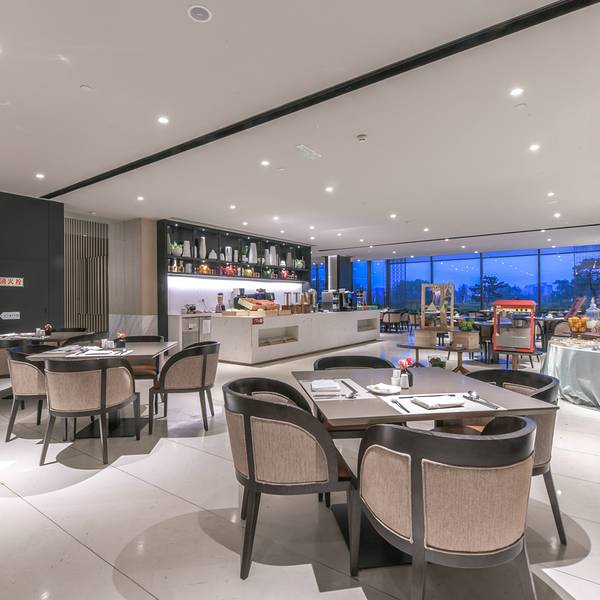 水沙涟斜对面的便是全日餐厅Ho Jia 9。“Ho Jia”一词来自于台湾话中“好吃”意思,它以自助餐厅的形式,网罗全球美馔,引入台式美食新理念,精心打造多款招牌料理创新吃 法,以 9 个开放式互动档口,为金陵食客奉上全新的味蕾惊艳之旅。整个餐厅比较开阔,长方体空间,内侧为各种美食档口,然后依次是餐位,双人、多人皆有。整个装修比较大气,暗色风格,幽雅,加上一面是落地窗户,直面酒店外面的大草坪,视野风景也不错。最推荐和让人惊喜的就是不限量的加拿大进口的新鲜波士顿龙虾,体大肥美,现做现吃,新鲜美味,真的十分满足!烧烤区是我比较喜欢的,这里现烤的生蚝,个大肥美,有扇贝,汁美香润,烤肉、金枪鱼等,都是现烤现吃,火候刚好,口感都不错。另外在这里还可以吃到正宗的南京鸭血粉丝汤,面汤档口,可以现点现做一碗南京鸭血粉丝汤,自己在配上一些辣油,香甜微辣,胃口大开!酒店的早餐也是在这里享用,当然酒店也提供客房送早的服务。 清晨起来,迎接着是窗外初阳下的江景,客房贴心的送来丰盛营养的早餐,白粥、果汁、蔬菜沙拉、水果、面包,中西合式,健康营养。 新的一天,在这样美好的风景和早餐下开启~