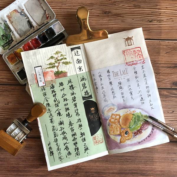 晨 · 食早餐位于一层的HoJia9餐厅,选择窗边的位置可以看到庭院和不远处的长江。没想到春节入住涵碧楼的客人很多,餐厅里充满节日的气氛。▲喜欢给早餐配色,这样才更有食欲。▲早餐要吃好,一样不能少。▲左页素材:南京涵碧便签纸背面。 ▲左页素材:南京涵碧便签纸正面。午 · 味上午抽空做完手帐,决定中午在一层的水沙涟中餐厅吃午饭。 水沙涟中餐厅需要提前预约,在这可以品尝到许多台湾特色美食。餐厅等候区域设有书法体验和品茶区,如有兴致可以体验一下。▲餐厅面积很大,私密性极佳。