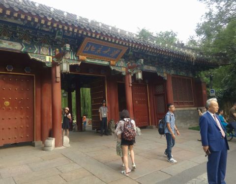 北京大学西校门在颐和园路5号,是1952年北京大学与燕京大学合并成为新的北京大学之前,燕京大学主校门。由燕京大学校友于1926年集资修建,所以又称为校友门。西校门坐东朝西,为古典三开朱漆宫门建筑,高不过七八米,风格古朴、庄严典雅,与颐和园东宫门相似,具有浓郁的民族风格。校门两侧有两头石狮。现在游人路过时,都喜欢拍照留念。那天我去的时候碰到一位日本学者访问北大,也在校门口拍照留影。一般游人进北大需要刷身份证才能进入。