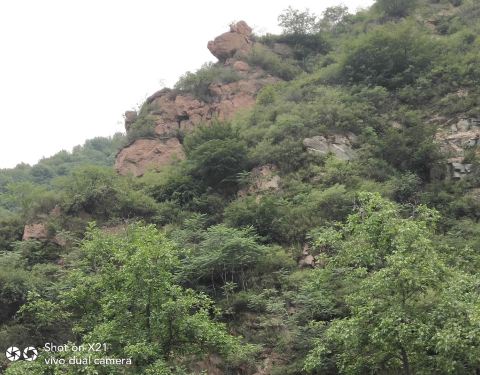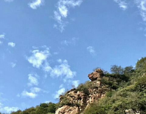 这里能看到猪圈沟景区标志山猪头山。有小孩子游乐设施-超级大石头。