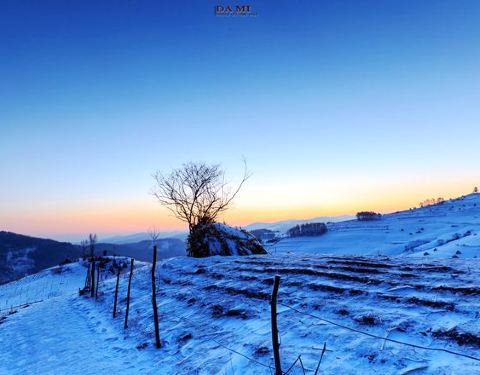 冬天的松岭雪村,就像是一幅浑然天成的水墨画:盖雪的瓦房上缓缓升起白色的炊烟, 泼墨色的林海点缀着白色的雪原,山岭上的梯田,勾勒出道道优美的曲线,而牛爬犁走过的小路,在雪地上画下浓墨重彩的一笔。