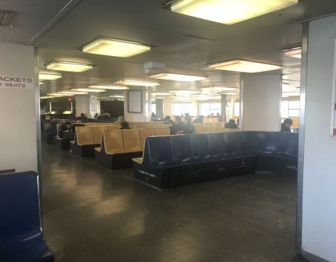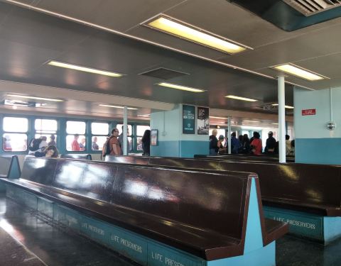 m15到底就是港口了,off peak 半小时一班,船超级大的,里面有洗手间,小卖部,上下两层,航行时间是25分钟,可以远观自由女神像和曼哈顿天际线,听说这个小岛上是没有地铁的,房价是纽约最便宜的,我们就乘了船...
