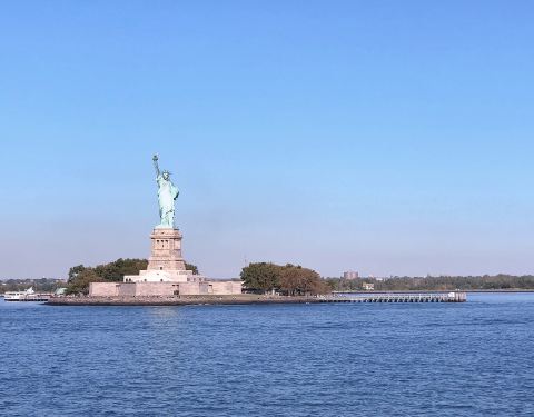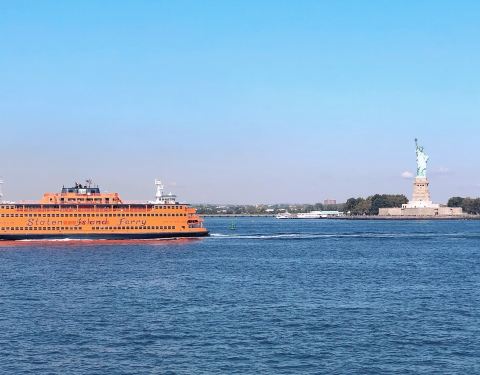 第二次来纽约,就不用特意花钱上岛看自由女神了。Staten Island Ferry坐一个来回,免费又舒心。因为两位小伙伴去坐船登自由岛了,我就一个人乐呵呵地坐了个来回轮渡。轮渡非高峰期是半小时一班,单程耗时差不多也是半小时的样子。Staten Island上没有特别吸引人的景点,在码头区域晒会儿太阳,就可以回去了。船上的人不算特别多,只要不坐在室内区域,随处都是景观位,一侧看自由女神,另一侧看曼哈顿。但海风吹得还是会有些冷,建议披一件外套或者戴个围巾吧。