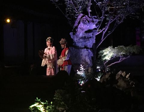 夜游体验在石路山塘街,靠近山塘街广济路那头,交通比较便利,离地铁很近。山塘街主街上人满为患,演出的地点在真趣园里,独一处安静之地。演出的内容也比较新颖,苏州的昆曲、评弹、苏州小调都能恰当融合,还有老苏州的叫卖声。最为有意思的是水上舞蹈,有种仙境的感觉,演员在水上舞台踢水的感觉不错,波光旖旎,特别是水中倒影,画面非常漂亮。总的来说,整体感觉不错,在实景的私家园林里,喝喝茶,看看戏,体验体验苏州人的生活,还是蛮惬意的。