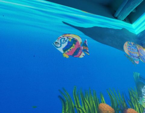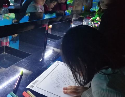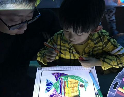 这里的亮点是动静结合,后来女儿安静的画了一幅画,看到自己画的鱼儿在海洋里游她特别开心