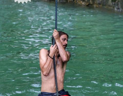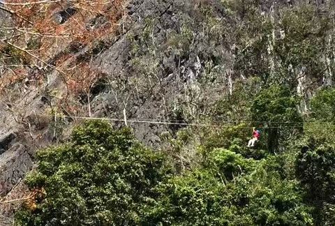 但这泻湖实在耀眼,人们争相到此,跳入蓝色的湖水中享受清凉,更可仰望帅哥穿越高空滑索