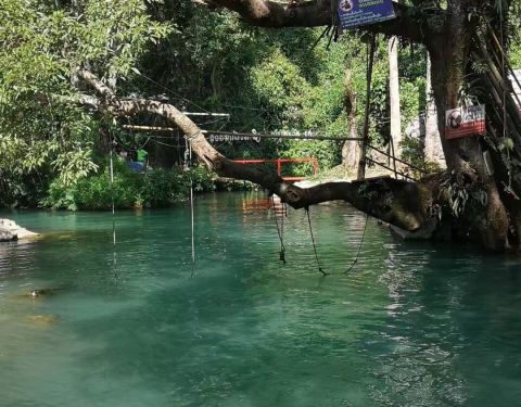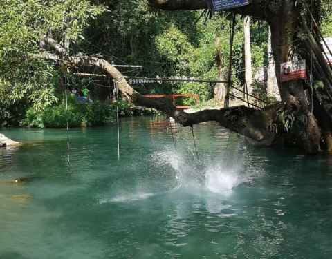 老挝的 蓝色泻湖是万荣最具魅力的景区,各国背包客都是因为它慕名而来。蓝色泻湖有小桂林之称。蓝色泻湖就在坦普坎溶洞口处,美丽的湖水都是从坦普坎溶洞里流出来的,这里非常好玩,非常刺激!