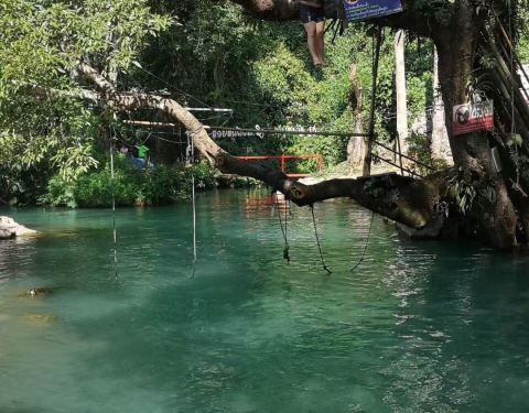 老挝万荣的“蓝色泻湖”只是从溶洞流出的水。但这泻湖实在耀眼,人们争相到此,跳入蓝色的湖水中享受清凉,更可仰望帅哥穿越高空滑索。