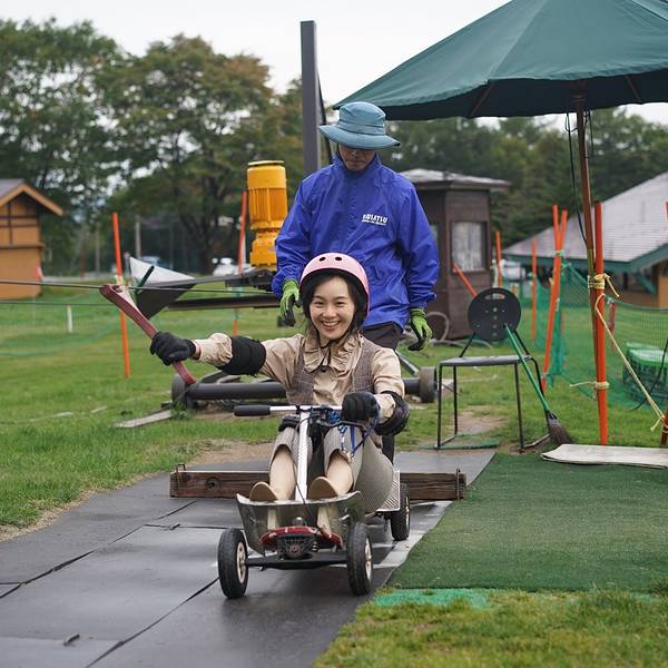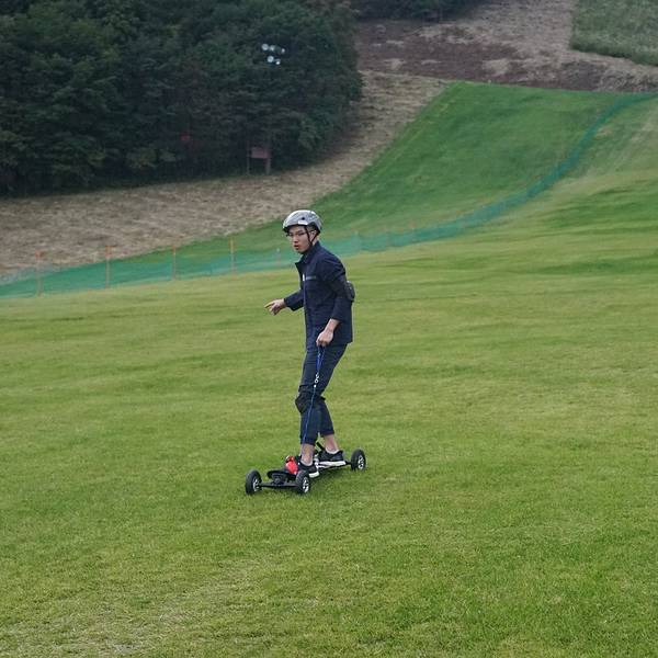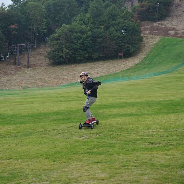 10月的天狗山,仍然绿油油,我们各自买了个滑草套餐,穿上护甲就出发啦滑草道具有两种,一种像滑板,一种像小型卡丁车 没有缆车?自己抓好那块扳手,对对对就是那块,来了来了啊,拽住它,用力哈别松开,诶对了, 走你!牵引的路上还要注意方向,不然很容易走歪,那就没人来管你了,自己玩个球把。小七七戴上头盔,小卡丁车滑起来有点sa子欢乐多的感觉滑板就不一样了,帅气依旧 不过多了一根安全绳拉着,速度也不会特别快滑草体验达成! 别有一番风味但我TM还是想滑雪啊!听说雪质超好的呢。。。