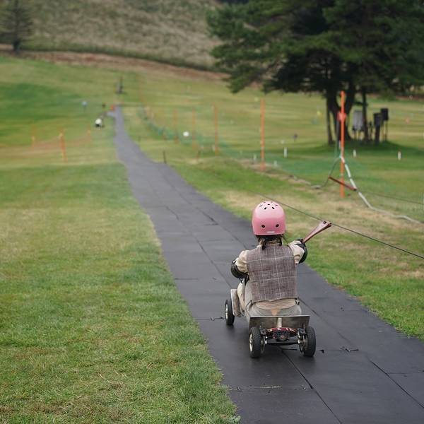 10月的天狗山,仍然绿油油,我们各自买了个滑草套餐,穿上护甲就出发啦滑草道具有两种,一种像滑板,一种像小型卡丁车 没有缆车?自己抓好那块扳手,对对对就是那块,来了来了啊,拽住它,用力哈别松开,诶对了,...
