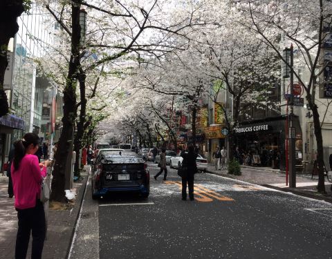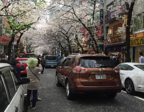 日本的樱花树谁处可见,八重州樱花大道,其实就是一条两边种满樱花树的,马路,嗯,完全就是可以边逛马路边看一下风景,而且这条路上都是商圈