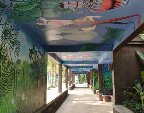 每次放假都会过来这里泡温泉,绿化挺不错的,与大自然融为一体,鸟语花香,温泉河里面好多鱼,问了一下这里的员工,还都是野生的,让他们帮忙抓一条,哈哈哈,下次炖个鱼汤喝一下,走廊里面的壁画挺有韵味的,管...