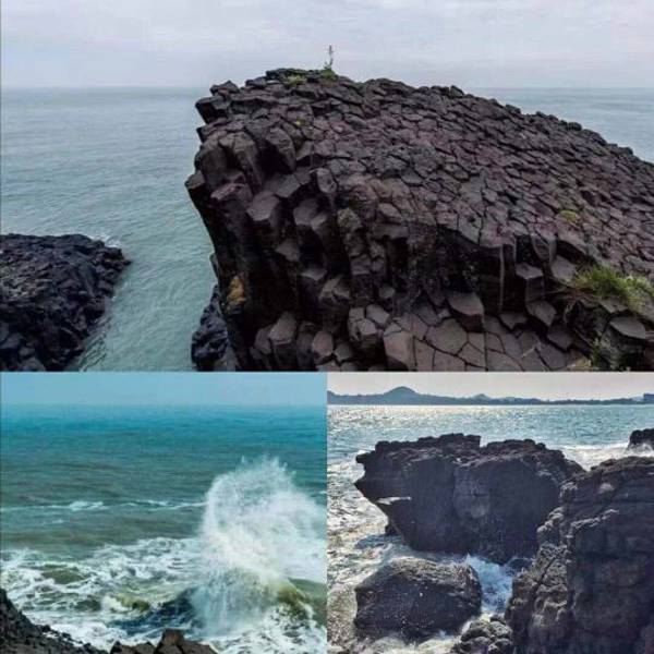 最令人惊叹的是“柱状节理群”,数十根六棱形的火山岩柱整齐排列,如同大自然亲手搭建的“石柱迷宫”,有的垂直矗立,有的微微倾斜,阳光穿过岩柱缝隙洒在海面上,波光粼粼间满是震撼。景区还贴心地在岩石旁设置了科普牌,标注着地质形成的年代与原理,带娃来的家长可以边逛边讲解,让孩子在游玩中了解自然知识,这也是火山岛区别于普通海滨景区的核心价值。