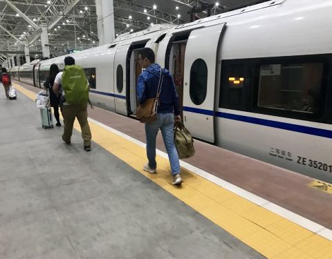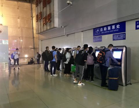 傍晚时分从南京博物院坐车一路驶向南京火车站,会经过一条非常漂亮的长长的梧桐大道,碰巧还赶上了美丽的夕阳。走进南京火车站,顿时觉得体感不太舒服,不知道是不是通风设备不太好,里面很闷热。餐饮店也不多,而且味道不佳。在候车口有自助取票机,这点比较方便。