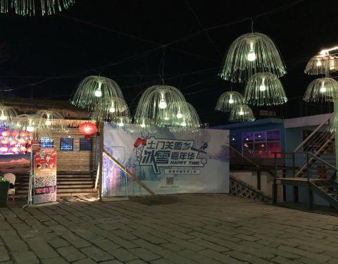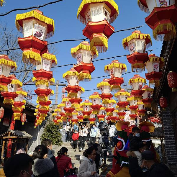 张灯结彩,一排节日快乐气氛。热闹非凡的土门关小镇