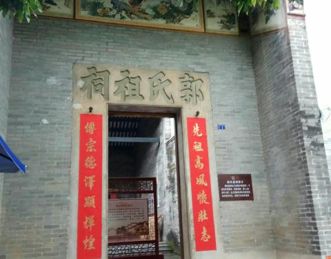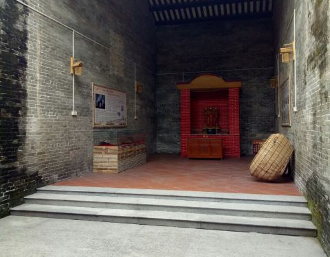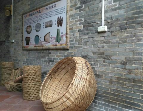 逢简水乡里各姓的祠堂多,这是其中之一,就在进口不远的河道边。走过就一个小小的门面,建筑看着挺新的,看介绍是2008年重修的。里面有两进吧,现在做为展厅,一边有很多竹编的日常工具,那是因为郭氏祖先以此技艺得以在逢简立足繁衍,如今很多工具似乎已无实际用处了。另一边有几块砖雕,这是在广东很多祠庙常见的装饰,一般都在高高的墙上,这里可以近距离细看。