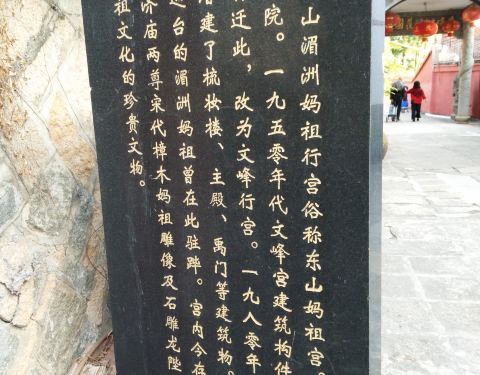 东山湄洲妈祖行宫位于莆田二十四景 “东山晓旭” 的东岩山附近,行宫呈狭长状,入口就像一条小巷口,规模很小,里面没有什么人气,右边有一个废弃的东山报恩寺,左面不远处三一教的东山祖祠,倒是香火很旺。 这里古为麟峰书院。上世纪50年代,文峰宫建筑构件及两尊宋代樟木雕妈祖像辗转迁此。1997年巡台的湄洲妈祖曾在此驻跸。 东山祖祠、林龙江先生纪念堂、妈祖行宫、东岩山公园这几个地方紧挨着,可以一起看,半天时间足矣。