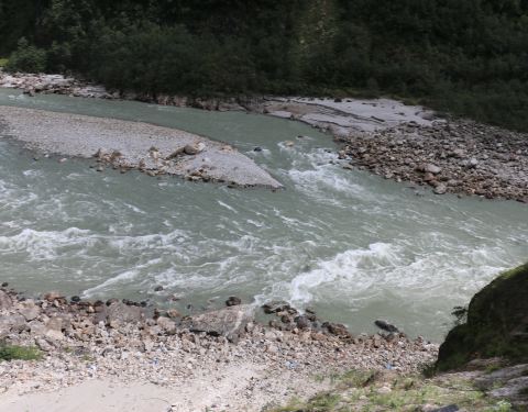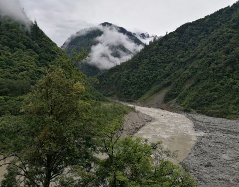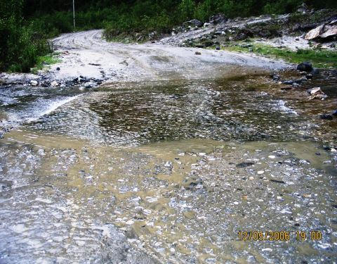 排龙至通麦15KM路段遍布雪山河流,山体疏松,脆弱,一遇风雪或冰雪融化,极易发生泥石流和塌方,特别是通麦一带有死亡路段之称。山洪和泥石流常引发山体滑坡而使公路中断,著名的102滑坡段就在其间。我们经过的时候正是细雨朦朦,云遮雾挡,道路狭窄崎岖,泥泞颠簸,一边是悬崖绝壁直顶天际,另一边还是悬崖绝壁直落谷地。我们的车左突右攻,突然一个上坡,跟着一个急转,接着一个下坡弯道,就这样跌跌撞撞的渐渐驶入了夜幕中。走完这段最艰险公路的最危险路段,仿佛像死里逃生般的如释重负.